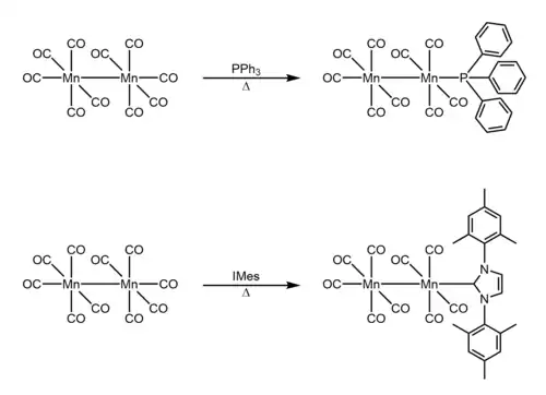 Ligand substitution reactions that do not disrupt the Mn-Mn bonding is done by using strongly sigma donating L-type ligands that can outcompete CO without participating in redox reactivity.[56] This requirement usually necessitates phosphines[57][58] or N-heterocyclic carbenes (NHCs),[59] with substitution occurring at the axial position according to the reactions below: