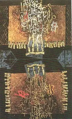 The geometric phase was his most characteristic phase. In this phase, he synchronized dialogue with Byzantine and Macedonian folk tradition.[4] His more recent work had a tendency to synthesize carefully selected sequences of the spiritual - the aesthetic and plastic repertoire of medieval art and those forms of nonfigurative and associated art, as traditionalist tissue could allow modern cohesion. His painting was a complex composite assemblage, with delicate and formal structures using various aesthetic and visual data, in order to become a work of art autonomous aesthetic phenomenon. These are bands that resemble the cult, sacred objects: through them constantly goes to a modern sense of the artist's inner needs, spiritual ritual, and aesthetics of these pieces to fit into the current art movement, the meditative and skeptics understanding of the world.[1]