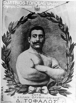 Dimitrios Tofalos (Greek: Δημήτριος Τόφαλος, April 14, 1884[1] in Patras, Greece – November 15, 1966) was a Greek weightlifter. He was a member of both Gymnastiki Etaireia Patron and Panachaikos Gymnastikos syllogos, that merged in 1923 to become Panachaiki Gymnastiki Enosi. Arguably the greatest weightlifter of the early 20th century, he won the gold medal in the 1906 Intercalated Games, setting a world record that lasted until 1914.[2] Dimitrios Tofalos Arena is named after him.