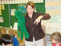 The Dimoitou program was originally created by a Quebec company known as "Centre éducatif et culturel" (now called Les Éditions CEC).[1] The program was often considered unusual by teachers and students alike, both because the name "Dimoitou" was never given a clear definition or meaning ("dimoi" and "tou" loosely translate to "tell me all", suggestive of a portmanteau), and because much of the program revolved around titular character Dimoitou being sick or injured, with accompanying workbooks teaching English-speaking children how to say French phrases revolving around injury, illness and pity. This led to a satire piece in 2019 released by journalist Shauna Chase and French teacher Giselle LeBlanc discussing the "death" of Dimoitou, which was no longer being included as part of the French curriculum in Atlantic Canada; LeBlanc revealed that she still had the original Dimoitou puppet, which was quite large, in a shoebox packed away in her classroom, sharing a photo of herself with the puppet and some of her students.[3]
