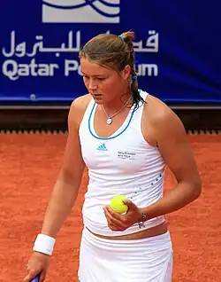 After winning a small tournament in Portorož,[75] Safina failed to defend her title in Los Angeles.[76] Despite this, she became the first player to qualify for the WTA Tour Championships.[77] The following week in Cincinnati, Safina advanced to her eighth final of the season,[78] losing to former world No. 1 Jelena Janković.[79] Safina was the top seed at the US Open, but lost in the third round to Petra Kvitová.[80]