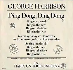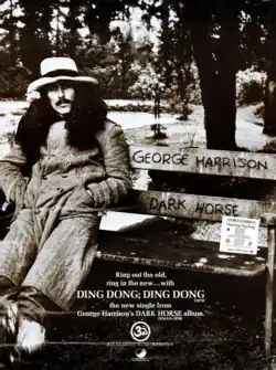 "Ding Dong, Ding Dong" is a song by English rock musician George Harrison, written as a New Year's Eve singalong and released in December 1974 on his album Dark Horse. It was the album's lead single in Britain and some other European countries, and the second single, after "Dark Horse", in North America. A large-scale production, the song incorporates aspects of Phil Spector's Wall of Sound technique, particularly his Christmas recordings from 1963. In addition, some Harrison biographers view "Ding Dong" as an attempt to emulate the success of two glam rock anthems from the 1973–74 holiday season: "Merry Xmas Everybody" by Slade, and Wizzard's "I Wish It Could Be Christmas Everyday". The song became only a minor hit in Britain and the United States, although it was a top-twenty hit elsewhere in the world.