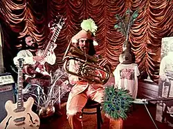 Harrison appears in a range of Beatles-related costumes while miming to the track.[42] His attire in these scenes represents a chronology of periods in the band's career[118] – starting with the Hamburg-era black leathers, followed by 1963 mop-top wig and grey collarless suit, and then the iconic Sgt. Pepper uniform from 1967.[11][123] During these scenes, he plays a mix of guitars, including his famous Rickenbacker 12-string,[123] as used in the Beatles' 1964 film A Hard Day's Night,[118] and the Gibson Les Paul (christened "Lucy")[124] that Clapton had used on the recording of "While My Guitar Gently Weeps" in September 1968.[125] The Sgt. Pepper portion shows Harrison playing a tuba while, behind him, an Indian man plays a sitar.[123] Harrison also re-creates Lennon and Ono's Two Virgins album cover, by appearing naked save for an acoustic guitar and a pair of furry boots.[118] Another change of costume and instrument, to denims and dobro, supports his stated rejection during the tour of early-'70s era, "Bangla Desh George".[118][126]