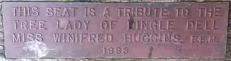 The Winifred Huggins Memorial Seat is dedicated to Winifred Huggins. Prime Minister Sir Robert Muldoon dedicated the seat on 18 March 184. The Mayor of Auckland Dame Catherine Tizard and 100 other guests attended. Huggins was not able to attend due to ill health.[4]