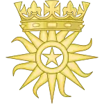 The badge of office is A mullet within an annulet rayonnee Or and enfiled in chief of a coronet of four fleurs-de-lys (two visible) and four crosses pattee (one and two halves visible) Or.[2]