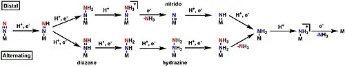While the mechanism for nitrogen fixation prior to the Janus E4 complex is generally agreed upon, there are currently two hypotheses for the exact pathway in the second half of the mechanism: the "distal" and the "alternating" pathway.[13][27][28] In the distal pathway, the terminal nitrogen is hydrogenated first, releases ammonia, then the nitrogen directly bound to the metal is hydrogenated. In the alternating pathway, one hydrogen is added to the terminal nitrogen, then one hydrogen is added to the nitrogen directly bound to the metal. This alternating pattern continues until ammonia is released.[13][27][28] Because each pathway favors a unique set of intermediates, attempts to determine which path is correct have generally focused on the isolation of said intermediates, such as the nitrido in the distal pathway,[29] and the diazene and hydrazine in the alternating pathway.[13] Attempts to isolate the intermediates in nitrogenase itself have so far been unsuccessful, but the use of model complexes has allowed for the isolation of intermediates that support both sides depending on the metal center used.[13] Studies with Mo generally point towards a distal pathway, while studies with Fe generally point towards an alternating pathway.[13][27][28][30][31]