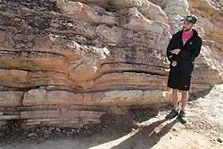 Volcanic Ash Bed – Bedded among layers of sandstone is a white layer of volcanic ash. In 2009, the Massachusetts Institute of Technology dated it to 104.6 Mya matching the Cretaceous Period of the fossil record. The ash came from volcanic fields far to the west.[8]