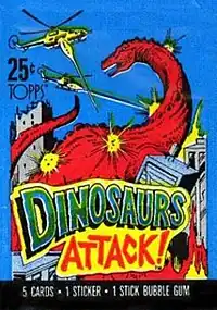 Dinosaurs Attack! is a trading card series by Topps released in 1988 and containing 55 base cards and 11 sticker cards. The cards tell the story of dinosaurs transported through time into the present day through a freak accident and wreaking havoc on Earth.[1] The series is notable for its graphic violence and gore, intended to evoke memories of the successful Mars Attacks trading card series of 1962.