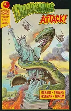 In 1991 Eclipse Comics began releasing a three-part miniseries based on the cards. However, due to the poor performance of both the comics and the trading cards they ended up only releasing the first issue.[6] The comic book also included four Dinosaurs Attack! bonus cards that had never been seen before and have not been reprinted since.