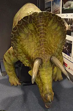 The production team had to be mindful of the series' budget when planning the effects and sets; Chibnall commented that "it would be very easy to spend £300m on this but we don't have it".[2] As such, the dinosaurs could not dominate the episode, and Chibnall had to tell "a big other story".[3] The scene where Amy, Riddell, and Nefertiti stumble upon a sleeping Tyrannosaurus rex was almost cut as it was originally intended to feature computer-generated (CGI) raptors, which were too expensive. However, Millennium FX realised they could use a baby T-Rex that had been in an exhibit they designed.[8] The episode contains a variety of "favourite" dinosaurs; some were built from scratch, while others were CGI.[3] Smith had to wear padded trousers when riding the triceratops, and recalled it was "a painful couple of hours, a laugh though and definitely worth it".[23] Half of the triceratops was actually built and pushed by crewmen when Smith, Darvill, and Williams were riding it. The rest of it was filled in with CGI by The Mill.[24] The Doctor Who logo in the title sequence featured the texture of a dinosaur's hide,[14] in keeping with the varied "blockbuster" themes for each of the opening five episodes of the series.[25] A preview clip of the episode was released at the 2012 San Diego Comic-Con.[1] Solomon's robots were modified versions of the Roboidz suits that Millennium FX had previously made for Mission: 2110.