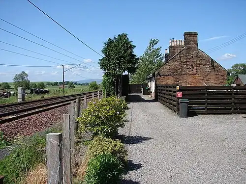 Trains pass at speed on the electrified West Coast Main Line. The stationmaster's house is now a private dwelling and the platforms have been demolished; the station cottages also survive as private dwellings. A signal box controlled the level crossing on the minor road which has now been closed and an overbridge built nearby.