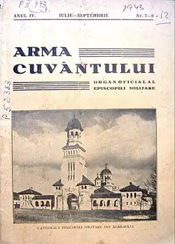 Vasile Saftu was the first bishop named to head the diocese in 1921; he died before fully assuming the role.[3] He was succeeded by Iustinian Teculescu, who was named in autumn 1922, began serving the following spring and left in late 1924.[4] Ioan Stroia was bishop from June 1925 until his death in April 1937.[5] The final office-holder was Partenie Ciopron, enthroned in October 1937.[6] The latter took over a decaying institution; his reforms helped grow the number of military priests from 30 in 1937 to 108 in 1941. In 1940, he established a diocesan magazine, Arma Cuvântului (“The Weapon of the Word”); it ran for 48 numbers, until 1944.[7]