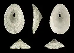 The shells of Diodora italica can reach a length of about 56 millimetres (2.2 in) and a width of about 25 millimetres (0.98 in). The basic color is whitish or grayish with small radial ribs and sometimes with 8-10 dark gray or brownish bands radiating from the centre.[3][4]