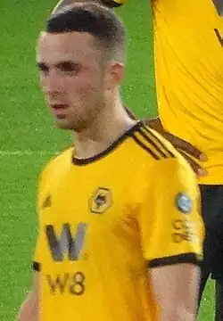 Jota made his debut in the Premier League on 11 August 2018, playing the full 90 minutes in a 2–2 home draw against Everton.[27] He scored his first goal in the competition on 5 December, helping the hosts come from behind to beat Chelsea 2–1.[28] His second came four days later, in a win at Newcastle United by the same scoreline.[29] On 19 January 2019, Jota scored three times in the 4–3 home victory over Leicester City – his second career hat-trick.[30] In the process, he became only the second Portuguese player to achieve the feat in the Premier League after Cristiano Ronaldo 11 years earlier.[31] This was a first-ever for the club in the competition and a first for the club in the top flight of English football since John Richards, against the same opposition, in the Football League First Division in October 1977.[32] On 16 March 2019, Jota scored the winning goal in a 2–1 win against Manchester United in the 2018–19 FA Cup, to help Wolves reach their first semi-final in the competition since 1997–98.[33]