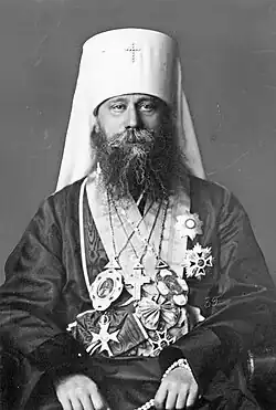 Konstantin was born in family of hereditary priests not far from Moscow in 1876.[2] He was a nephew of Arbishop Hieronim (Eksempliarsky)[3] who served as Archbishop of Warsaw (1898 — 1905) and Archbishop of Wilno (1894 — 1898). Konstantin lost his father early when he was only 12.[4] In 1897 Konstantin Valedinsky graduated a theological seminary in Ufa.[2] Already as a student of the Kazan Theological Academy during his first year of study he was tonsured as a monk with the name of Dionysius (Dionisios[4]) and during the same year was consecrated as a deacon.[2] In 1899 Dionysius (Valedinsky) became hieromonk and was consecrated by Antony (Khrapovitsky) as a priest (iereus).[2] He graduated the academy in 1900 as a magister in theology.[2] (candidate of theology[4]) His graduating dissertation was "Ideals of Orthodox-Russian foreign missionary work".[4] Due to his poor health Dionysius was not able to become a missionary.[4] In 1901-02 Dionysius was teaching a history of the Church in the Taurida Theological Seminary in Simferopol.[2]