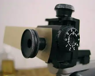 A diopter sight is an aperture sight component used to assist the aiming of ranged weapons, mainly firearms, airguns, and crossbows. Diopters function to precisely align the shooter's eye with the front sight and the target, while also producing beneficial optical effects for accurate aiming. A diopter must be paired with a complementing front sight element to obtain a usable sighting line. Diopter sights used for modern target shooting allow for very fine windage and elevation adjustments, moving the impact point on the order of less than five millimeters at a range of 100 metres. High end diopters typically accept accessories to aid the shooter's ability to see the target clearly.