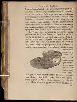 - Now consider that, since there is no vacuum in Nature as almost all the Philosophers affirm, and since there are nevertheless many pores in all the bodies that we perceive around us, as experiment can show quite clearly, it is necessary that these pores be filled with some very subtle and very fluid material, extending without interruption from the stars and planets to us. Thus, this subtle material being compared with the wine in that vat, and the less fluid or heavier parts, of the air as well as of other transparent bodies, being compared with the bunches of grapes which are mixed in, you will easily understand the following: Just as the parts of this wine...tend to go down in a straight line through the hole [and other holes in the bottom of the vat]...at the very instant that it is open...without any of those actions being impeded by the others, nor by the resistance of the bunches of grapes in this vat...in the same way, all of the parts of the subtle material, which are touched by the side of the sun that faces us, tend in a straight line towards our eyes at the very instant that we open them, without these parts impeding each other, and even without their being impeded by the heavier particles of transparent bodies which are between the two.[2]