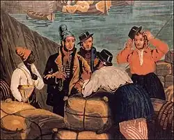 Rebuilt by Harry Truman as a sitting room, it was refurbished in 1960 during the Dwight Eisenhower administration in the style of the Federalist Era[1] with antiques selected by New York interior designer Michael Greer. In 1962, with advice from American antique expert Henry Francis du Pont, First Lady Jacqueline Kennedy had the room papered with antique French scenic wallpaper produced by Jean Zuber et Cie in Rixheim (Alsace), France c. 1834. The Zuber wallpaper, titled Scenes of North America, was printed from multiple woodblocks and features scenes of Boston Harbor, the Natural Bridge in Virginia, West Point, New York, Niagara Falls, and New York Harbor. The sweeping panorama on the elliptical walls provide a sense of space, negating the lack of windows. Additional Federal-era furniture was acquired, and upholsteries and the carpet furthered a soft gold and blue decor.