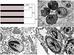 The internal structure of the bacteria was atypical. Electron-dense crystal-like structures were identified to be located in the center of almost all bacteria, usually surrounded by multilayer sheath-like structures. These layers alternate with electron-dense bands (6 nanometers) and light bands (15 nanometers). Up to seven electron-dense layers may be found in a single bacterium.