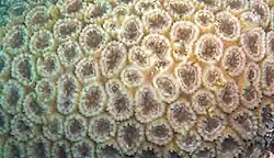 Dipsastraea speciosa is one of the types of corals that synchronizes its time of spawning. This reproductive synchrony increases the likelihood that male and female gametes will meet. Spawning tends to take place in the evening or at night, around the last quarter moon of the lunar cycle.[8][9][10] A full moon is equivalent to four to six hours of continuous dim light exposure, which can cause light-dependent reactions in protein.[8][11] Corals contain light-sensitive cryptochromes, proteins whose light-absorbing flavin structures are sensitive to different types of light. This allows corals such as Dipsastraea speciosa to detect and respond to changes in sunlight and moonlight.[8] Moonlight itself may actually suppress coral spawning. The most immediate cue to cause spawning appears to be the dark portion of the night between sunset and moonrise. Over the lunar cycle, moonrise shifts progressively later, occurring after sunset on the day of the full moon. The resulting dark period between day-light and night-light removes the suppressive effect of moonlight and enables coral to spawn.[8][9] Light pollution desynchronizes spawning in some coral species.[8]