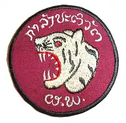 Unlike the FAR, the GMS and DNC never developed a distinctive unit insignia nor a beret badge, and even rank insignia was seldom seen on uniforms; a commemorative embroidered red round patch edged black bearing a snarling tiger's head surmounted by the Laotian inscription "Revolutionary Forces" (Lao language: ກຳ ລັງປະຕິວັດ | kam lang pativad), which celebrated Siho's recapture of Vientiane in 1960, was worn on the left shoulder. In 1962 the DNC adopted a distinctive set of gold parachute wings in three classes modelled after the PARU airborne qualification badge, which were worn above the right pocket of the fatigue shirt.[9]