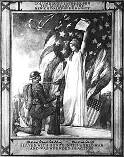 The organization's seal has since its foundation featured a World War I soldier, armed, kneeling before Columbia, who dubs the man knight. The logo design was taken from certificates used in World War I for sick and wounded veterans.[4] A painting by the American painter Edwin Blashfield, commissioned by the 28th President of the United States Woodrow Wilson, the certificate featured above the words "Columbia Gives to Her Son the Accolade of the New Chivalry of Humanity" and, below, the words "Served With Honor in the World War and Was Wounded in Action."[15]
