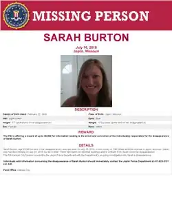 - ^ "Reward increased in Sarah Burton missing person case". Joplin Globe. 2024-07-22. Retrieved 2025-01-15.