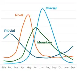 If the peak is in May or June on the Northern Hemisphere, or November or December on Southern Hemisphere, followed by the other of those two, the regime is called mild nival.[28]