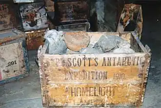 When the Discovery finally left McMurdo Sound, the hut was stripped of all gear, including the stove, but there was left behind a large depot of the stores mentioned above.