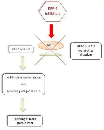 Dipeptidyl peptidase-4 inhibitors (DPP-4 inhibitors) are enzyme inhibitors that inhibit the enzyme dipeptidyl peptidase-4 (DPP-4). They are used in the treatment of type 2 diabetes mellitus. Inhibition of the DPP-4 enzyme prolongs and enhances the activity of incretins that play an important role in insulin secretion and blood glucose control regulation.[1] Type 2 diabetes mellitus is a chronic metabolic disease that results from inability of the β-cells in the pancreas to secrete sufficient amounts of insulin to meet the body's needs. Insulin resistance and increased hepatic glucose production can also play a role by increasing the body's demand for insulin. Current treatments, other than insulin supplementation, are sometimes not sufficient to achieve control and may cause undesirable side effects, such as weight gain and hypoglycemia. In recent years, new drugs have been developed, based on continuing research into the mechanism of insulin production and regulation of the metabolism of sugar in the body. The enzyme DPP-4 has been found to play a significant role.[2]