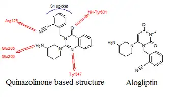 Alogliptin (Figure 9) is a novel DPP-4 inhibitor developed by the Takeda Pharmaceutical Company.[22] Researchers hypothesized that a quinazolinone based structure (Figure 9) would have the necessary groups to interact with the active site on the DPP-4 complex. Quinazolinone based compounds interacted effectively with the DPP-4 complex, but suffered from low metabolic half-life. It was found that when replacing the quinazolinone with a pyrimidinedione, the metabolic stability was increased and the result was a potent, selective, bioavailable DPP-4 inhibitor named alogliptin. The quinazoline based compounds showed potent inhibition and excellent selectivity over related protease, DPP-8. However, short metabolic half-life due to oxidation of the A-ring phenyl group was problematic. At first, the researchers tried to make a fluorinated derivative. The derivative showed improved metabolic stability and excellent inhibition of the DPP-4 enzyme. However, it was also found to inhibit CYP 450 3A4 and block the hERG channel. The solution to this problem was to replace the quinazolinone with other heterocycles, but the quinazolinone could be replaced without any loss of DPP-4 inhibition. Alogliptin was discovered when quinazolinone was replaced with a pyrimidinedione. Alogliptin has shown excellent inhibition of DPP-4 and extraordinary selectivity, greater than 10.000 fold over the closely related serine proteases DPP-8 and DPP-9. Also, it does not inhibit the CYP 450 enzymes nor block the hERG channel at concentration up to 30 μM. Based on this data, alogliptin was chosen for preclinical evaluation.[23] In January 2007 alogliptin was undergoing the phase III clinical trial and in October 2008 it was being reviewed by the U.S. Food and Drug Administration.[24]