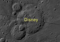 Disney is an impact crater in the H-15 (Bach) Quadrangle of Mercury.[1] It was approved and adopted by the IAU on Dec 19, 2012.[2] Disney is 113 km (70 mi) in diameter. This crater was named after Walt Disney (Walter Elias), the American entrepreneur, voice actor, film producer, and animator. Disney is one of many craters named after notable art figures; per the Working Group for Planetary System Nomenclature, Mercury's craters are all named after a famous artist, composer, or writer who was influential for more than 50 years and deceased for more than three years at the time the crater was named.[3] Disney was named months after NASA acknowledged it for its resemblance to Mickey Mouse.[4]