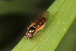 Though there are few studies on the herbivores of Disphyma australe, some species that feed on the plant are known. Among them is the hoverfly Melanostoma fasciatum, which pollinates Disphyma australe. Aethina concolor, however, is an adventive, herbivorous beetle that eats the flowers.[17] Another beetle that feeds on Disphyma australe is Holoparamecus spp.[18] The leaves can be infested with sucking bugs such as the scale insects Poliaspis media, which might cause galls on the underside of leaves, and the introduced Pulvinaria mesembryanthemi, a bug specialised to host plants of the Mesembryanthemum family.[17] Additionally, larvae of the plantain moth (Xanthorhoe rosearia) and the springtail species Hypogastrura rossi can be found on the plant.[18]