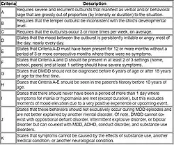 | Symptoms | Persistent irritability, recurrent outbursts of anger that exceeds the typical reaction of same-aged peers, difficulty regulating emotions |