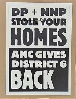 District Six (Afrikaans: Distrik Ses) is a residential neighborhood in Cape Town, South Africa, located next to the city's CBD. In 1959, people of color were banned from the area and most of them were resettled in Gugulethu. In the following years, District Six was then declared a whites-only area and most of the residents were resettled in the Cape Flats.[1] Over the course of a decade, over 60,000 of its inhabitants were forcibly removed and in 1970 the area was renamed Zonnebloem, a name that makes reference to an 18th-century colonial farm.[2][3][1] At the time of the proclamation, 56% of the district's property was White-owned, 29% Black-owned, 26% Coloured-owned and 18% Indian-owned.[4][5][1] The vision of a new white neighbourhood was not realised and the land has mostly remained barren and unoccupied.[1] The original area of District Six is now partly divided between the suburbs of Walmer Estate, Zonnebloem, and Lower Vrede, while the rest is generally undeveloped land.