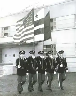 During the 1940s, the DCNG recruited members from various units to participate in performing the Honor Guard protocol. In the picture to the right, five members of the DCARNG, are shown practicing ceremonial flag carry in front of the DCNG armory, located in Washington, DC.