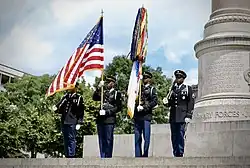 The pictures below depict the DCARNG Honor Guard participating in Memorial Day ceremonies, held at President's Park, in Washington, DC, during 2018 and 2019. The DCARNG Honor Guard supported the 1st Infantry Division's Memorial Day annual ceremony.[14] In a few pictures shown below, Honor Guardsmen are playing "Taps", giving a three-volley salute, and standing ready to give military honors to fallen comrades.