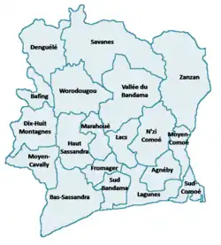 Prior to September 2011, Ivory Coast's first-level administrative subdivisions were 19 regions. In 2011, the regions were reorganized into the 14 districts (12 regular districts and 2 autonomous districts).[1][2] In 2014, the districts were abolished except for the two autonomous districts of Abidjan and Yamoussoukro. Then in 2021 the former districts were reinstated as autonomous districts.[7] The following is a summary of how the districts were constructed from the former regions: