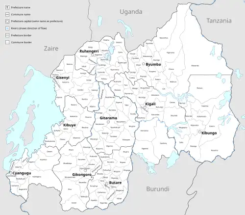 Prior to 2002, Rwanda was composed of prefectures, subprefectures (which were sometimes called "districts")[1] and 154 communes (Kinyarwanda: imijyi, sing. umujyi).[2][3] In 2002, communes were replaced by two kinds of divisions called districts and municipalities (Kinyarwanda: akarere and umujyi).[2] In 2006, the number of districts was reduced from 106 to 30.[2]