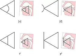 - Plosives are indicated by straight lines in the same position as their fricative counterparts.