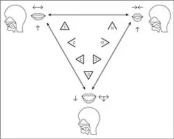 The apex of the triangle or chevron corresponds to vowel height or frontedness, with high vowels /i/ and /u/ pointing upwards and the low vowel /a/ pointing downwards. Likewise, the front vowels /ɛ/ and /e/ point leftwards and the back vowels /ɔ/ and /o/ point rightwards.