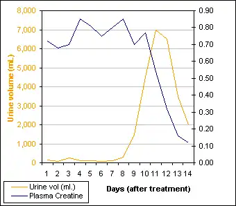 The kidney's resorptive mechanisms are particularly energetic, using nearly 100% of the O2 supplied. Thus, the kidney is particularly sensitive to reduction in blood supply. This phenomenon occurs because renal flow is restored prior to the normal resorption function of the renal tubule. As shown by the graph, urine flow recovers rapidly and subsequently overshoots the typical daily output (between 800 mL and 2L in most people). Since the kidney's resorption capacity takes longer to re-establish, there is a minor lag in function that follows recovery of flow. A good reference range for plasma creatinine is between 0.07 - 0.12 mmol/L.[10]
