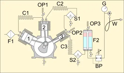 The last part of the compressor gas circuit is the back-pressure valve. This is a spring-loaded valve that opens to allow flow of air only after the pressure reaches the set pressure. It is usually set to a pressure close to the working pressure of the compressor, and has two basic functions.[6] Firstly it ensures that after a short starting period, all of the compressor stages are operating at their designed discharge pressures, so that the loads on the pistons are steady and evenly distributed round the crankshaft. This is the loading at which the compressor is balanced at the designed running speed. When the pressure in any cylinder is different from the nominal pressure, the loads will be unbalanced and the compressor will vibrate more than when balanced, and the shaft bearings will be more severely loaded and will wear faster. During start-up the compressor first builds up pressure on the first stage, and is unbalanced, with a greater load on that cylinder's piston, and will vibrate more than normal, as there is no equivalent load on the other stage pistons, then pressure in the other stages builds up in sequence, until all cylinders are operating at their working pressures, the loads on all the pistons are similar, and the back-pressure valve starts to open to let the compressed gas flow to the distribution panel.[6]