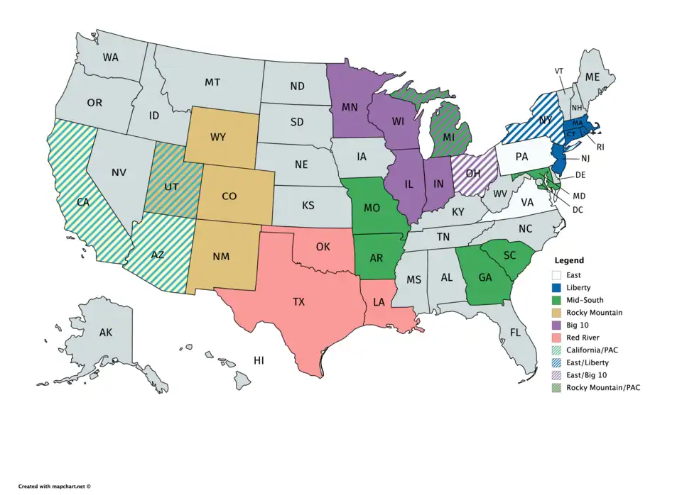 Pacific gold -- West green -- Mid-South blue -- East red