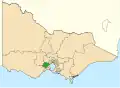 As of the 2024 redistribution, the division comprises an area of 1,216 square kilometres (470 sq mi) from the western shores of Port Phillip Bay, stretching to the north of Geelong and inland.[7] As of 2013, besides Geelong, it included Avalon, Bannockburn, Bell Park, Bell Post Hill, Belmont, Breakwater, Corio, Drumcondra, Fyansford, East Geelong, North Geelong, South Geelong, Geelong West, Hamlyn Heights, Herne Hill, Highton, Lara, Lovely Banks, Manifold Heights, Moolap, Newcomb, Norlane, North Shore, Portarlington, St Albans Park, Rippleside and Whittington; and parts of Anakie, Batesford, Clifton Springs, Fyansford, Leopold, Newtown, and Thomson.