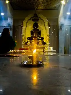 On Diwali morning, Nirvan Ladoo is offered after praying to Lord Mahavira in all Jain temples across the world.[4] The most important principle of Jains is Ahimsa, or non-violence; therefore, they tend to avoid firecrackers during Diwali as they can harm living organisms. Diwali is celebrated in an atmosphere of austerity, simplicity, serenity, equity, calmness, charity, philanthropy, and environmental consciousness. Jain temples, homes, offices, and shops are decorated with lights and diyas. Relatives distribute sweets to each other. The lights symbolize knowledge and the removal of ignorance. Swetambar Jains observe two days of fasting in remembrance of the penance and sacrifice of Mahavira. In temples and homes, devotees sing hymns and chant mantras from Jain religious texts in praise of the Tirthankar, congregating for prayers and reciting verses from the Uttaradhyayan Sutra, which contain the last teachings of Mahavira. Jains also visit Pawapuri and Nalanda in Bihar on this special day to offer their prayers. The Jain year starts with Pratipada, the day after Diwali.[5]