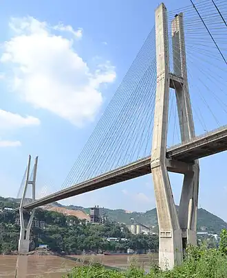 The Diwei Bridge is a cable-stayed bridge which crosses the Yangtze River in Chongqing, China. Completed in 2008, it has a main span of 345 metres (1,132 ft). The bridge carries road of traffic between the Jiangjin District south of the Yangtze River and the Dadukou District to the north.[1]
