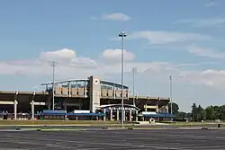 Dix Stadium is located along Summit Street in Kent, just east of the intersection of Summit Street and Ohio State Route 261, on the eastern edge of the Kent State University main campus. The stadium was annexed into the city of Kent in 2002 after having previously been part of Franklin Township.[17] Adjacent to the stadium are facilities and practice fields for several other Kent State athletic teams. When the stadium was built, a cinder track was included on the site, northeast of the stadium. While the track is no longer used for competitions, it surrounds a natural grass playing surface that was previously known as Zoeller Field, the former home of the Kent State women's soccer team. The field was constructed in 1990 as the home of the field hockey team, becoming the home of the women's soccer team in 1997. It was upgraded in 2010, but the team moved all home games to Dix Stadium in 2016 and during soccer games, the playing surface is known as Zoeller Field.[18]