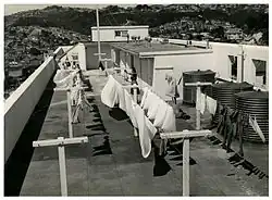 The building was officially opened on 4 September 1943, six months before it was completed, because a general election was coming up and the flats were good publicity for the Labour Party's election campaign.[3][4] The flats were originally intended to house single women and retired couples, but by 1943 many soldiers were returning from war service and getting married, so it was decided to give them preference.[5] Ten stories high, the building contained 115 one-bedroom flats plus a two-bedroom caretaker's flat. At the official opening the Minister of Works commented on features that were notable at the time: provision of privacy, sunlight and soundproofing. The flats were also to be wired up for radio reception, with an aerial connection in each home.[4] The building featured a mural by Australian artist Nancy Bolton.[6]