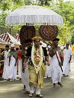 Prior to 1815, during the Kingdom of Kandy, the Diyawadana Nilame was a courtier of the royal court tasked with supplying the King with water and carrying out the ancient rituals to ensure rain during correct seasons.[2][3] This duty is still carried out by the Diyawadana Nilame for the most relic of the tooth of the Buddha, marked by the water cutting ceremony on the final day of the Esala Perahera.[4]